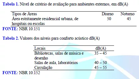 Os níveis de pressão sonora para ambientes externos e internos respectivamente, indicado nas normas 10.151 e 10.152 (ABNT, 2000; 1987), estão expressos nas Tabelas 1 e 2.