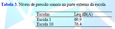 Com o objetivo de verificar o incômodo causado pelo tráfego urbano nas dependências das escolas mediu-se o nível de pressão sonora nas imediações de duas instituições. Os resultados para o nível de pressão sonora equivalente estão expressos na Tabela 3.