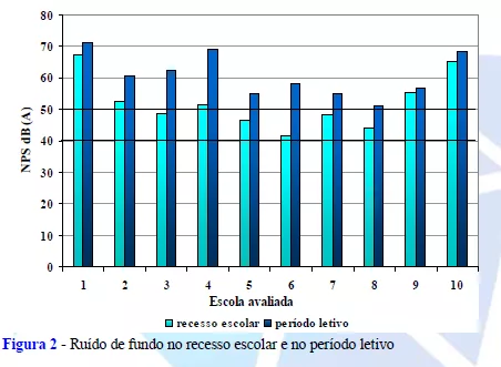 A análise dos valores de ruído de fundo obtidos durante o recesso escolar e no período de atividades normais mostrou que os níveis de pressão sonora estão muito além daqueles recomendados pelas normas. São normas regidas por instituições governamentais, como a Secretaria de Educação do Distrito Federal (SEDF), que não são observadas.