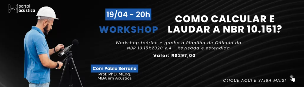 Caso essas sejam suas dúvidas, você está com sorte, pois no dia 19 de abril vai acontecer o quarto Workshop sobre a norma NBR 10151 do Portal Acústica. Nesse workshop serão sanadas todas as dúvidas sobre laudos acústicos a partir da norma 10151 e além disso será apresentada uma planilha de Excel com todos os cálculos necessários para você realizar um laudo acústico utilizando essa norma. Esse material foi desenvolvido pelos profissionais do Portal Acústica, que irão dar todo o suporte necessário para que você se torne expert em laudos acústicos.